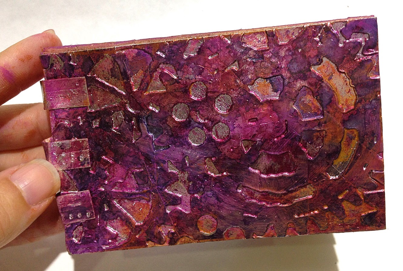 I use one of my favorite embossing folders in my Cuttlebug machine and dab with a variety of reds and purple Ranger Adirondack Alcohol Inks to add color and depth to my distressed aluminum cardstock.